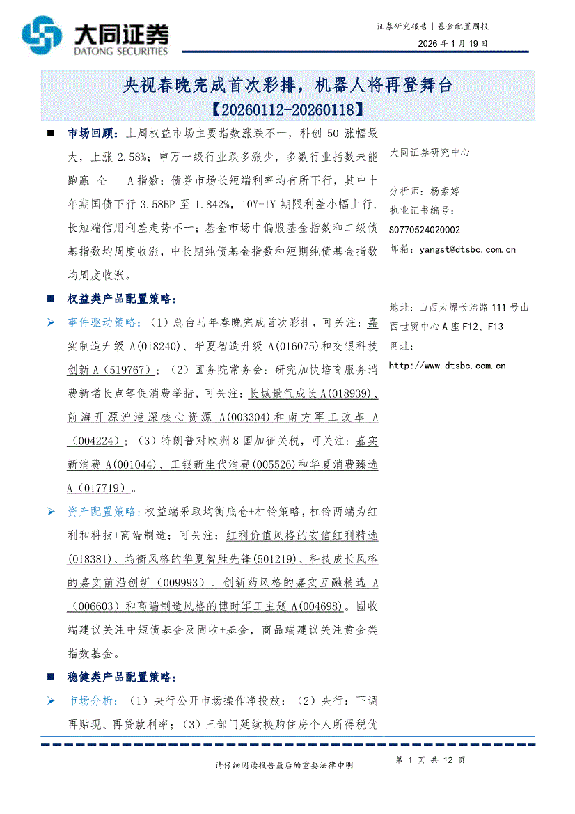 大同证券-基金配置周报:央视春晚完成首次彩排,机器人将再登舞台-260119