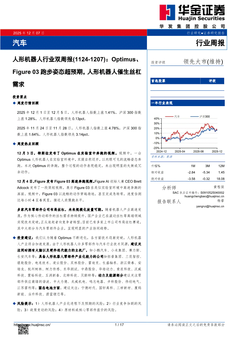 人形机器人行业:华金证券-人形机器人行业双周报:Optimus、Figure 03跑步姿态超预期,人形机器人催生丝杠需求-251207