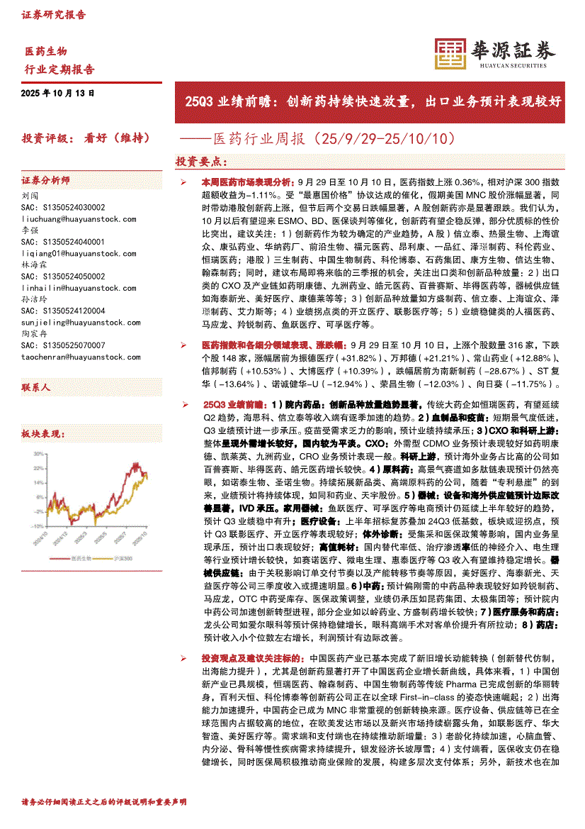 医药行业:华源证券-医药行业周报:25Q3业绩前瞻,创新药持续快速放量,出口业务预计表现较好-251013