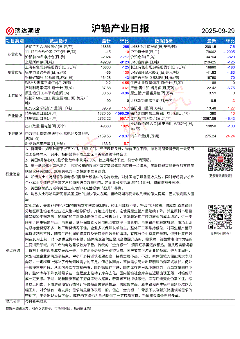 瑞达期货-沪铅产业日报-250929