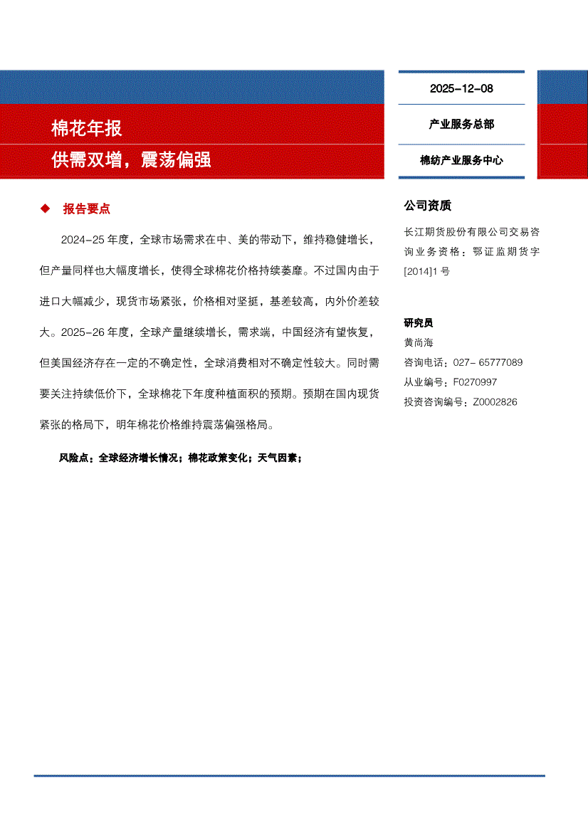 长江期货-棉花年报:供需双增,震荡偏强-251208