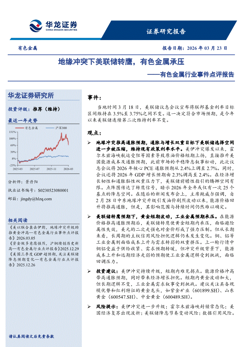 有色金属行业:华龙证券-有色金属行业事件点评报告:地缘冲突下美联储转鹰,有色金属承压-260323