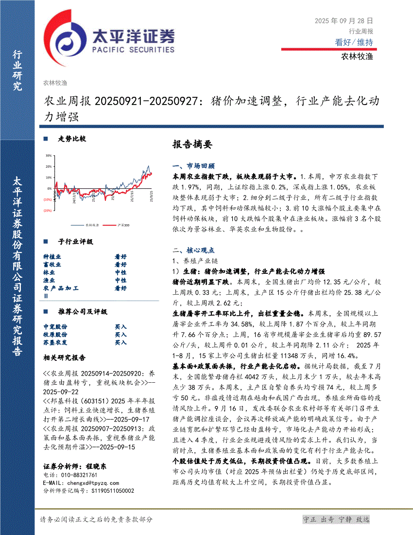 农业:太平洋证券-农业周报:猪价加速调整,行业产能去化动力增强-250928