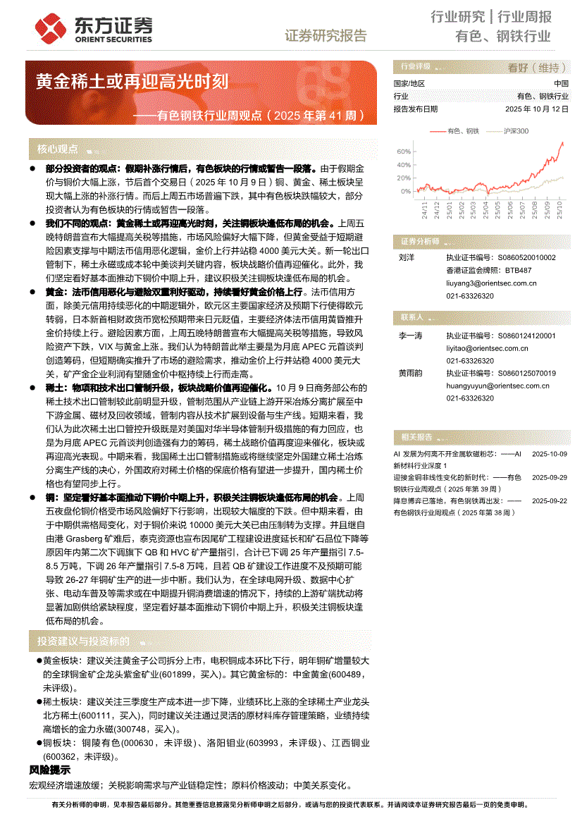 有色、钢铁行业:东方证券-有色钢铁行业周观点(2025年第41周):黄金稀土或再迎高光时刻-251012
