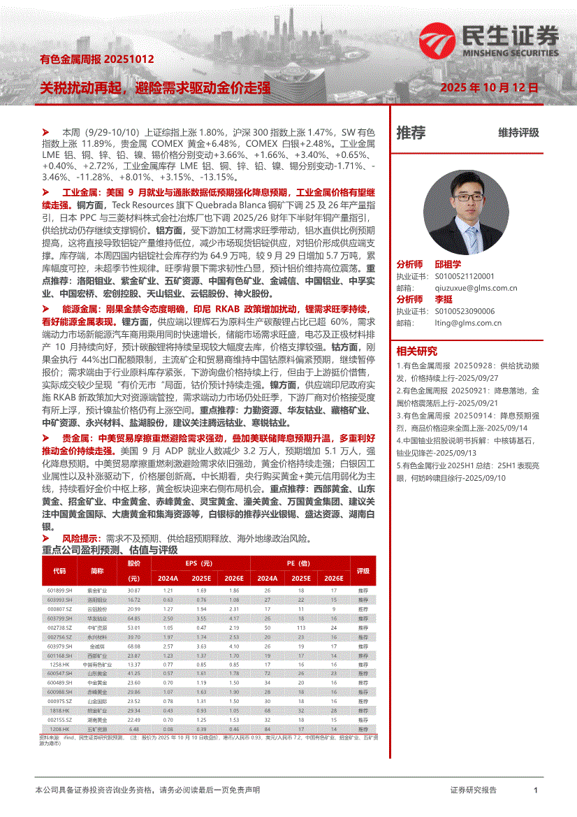 有色金属行业:民生证券-有色金属行业周报:关税扰动再起,避险需求驱动金价走强-251012