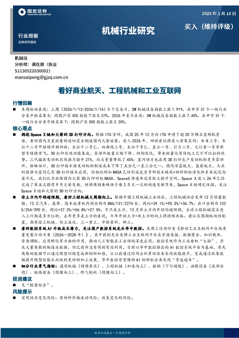 机械行业:国金证券-机械行业周报:看好商业航天、工程机械和工业互联网-260118