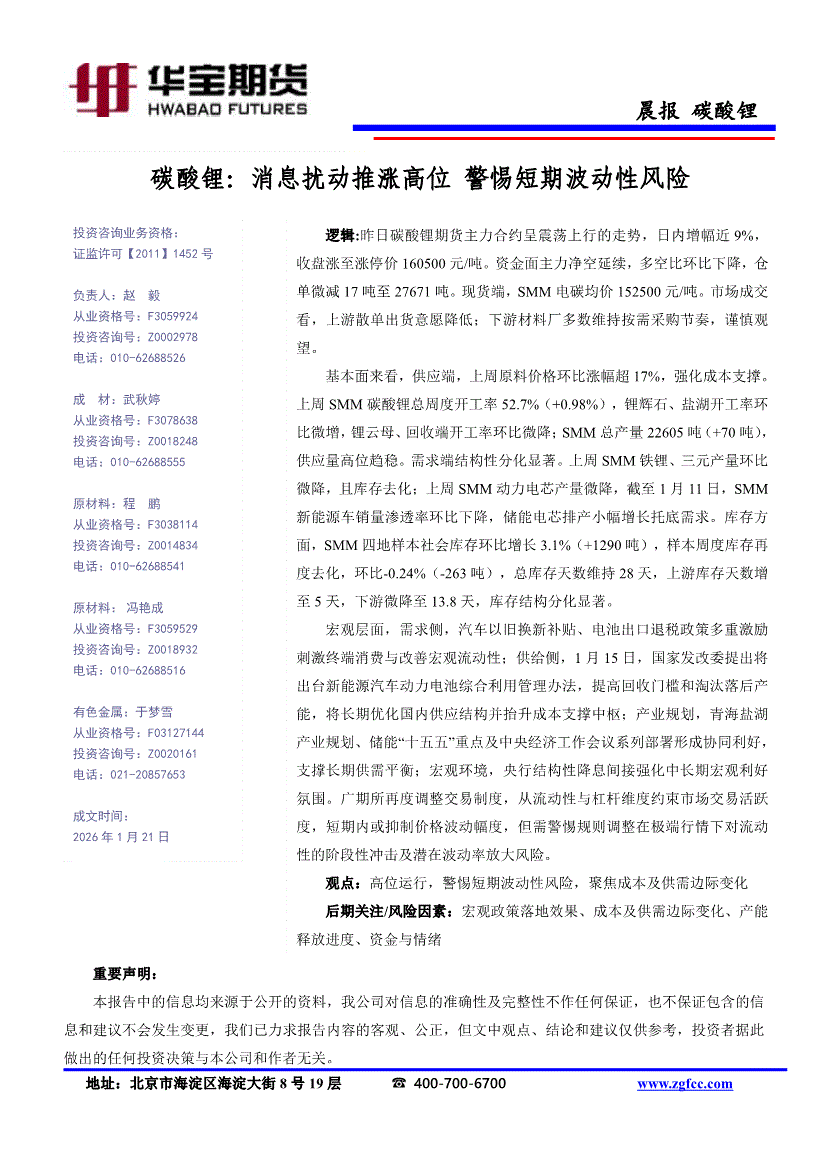 华宝期货-碳酸锂晨报:消息扰动推涨高位,警惕短期波动性风险-260121