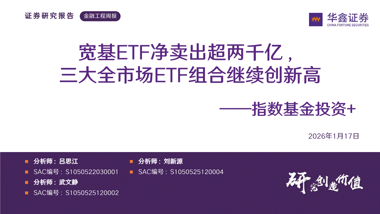 华鑫证券-指数基金投资+:宽基ETF净卖出超两千亿,三大全市场ETF组合继续创新高-260117