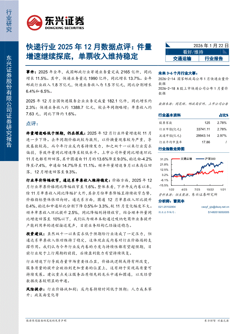快递行业:东兴证券-快递行业2025年12月数据点评:件量增速继续探底,单票收入维持稳定-260122