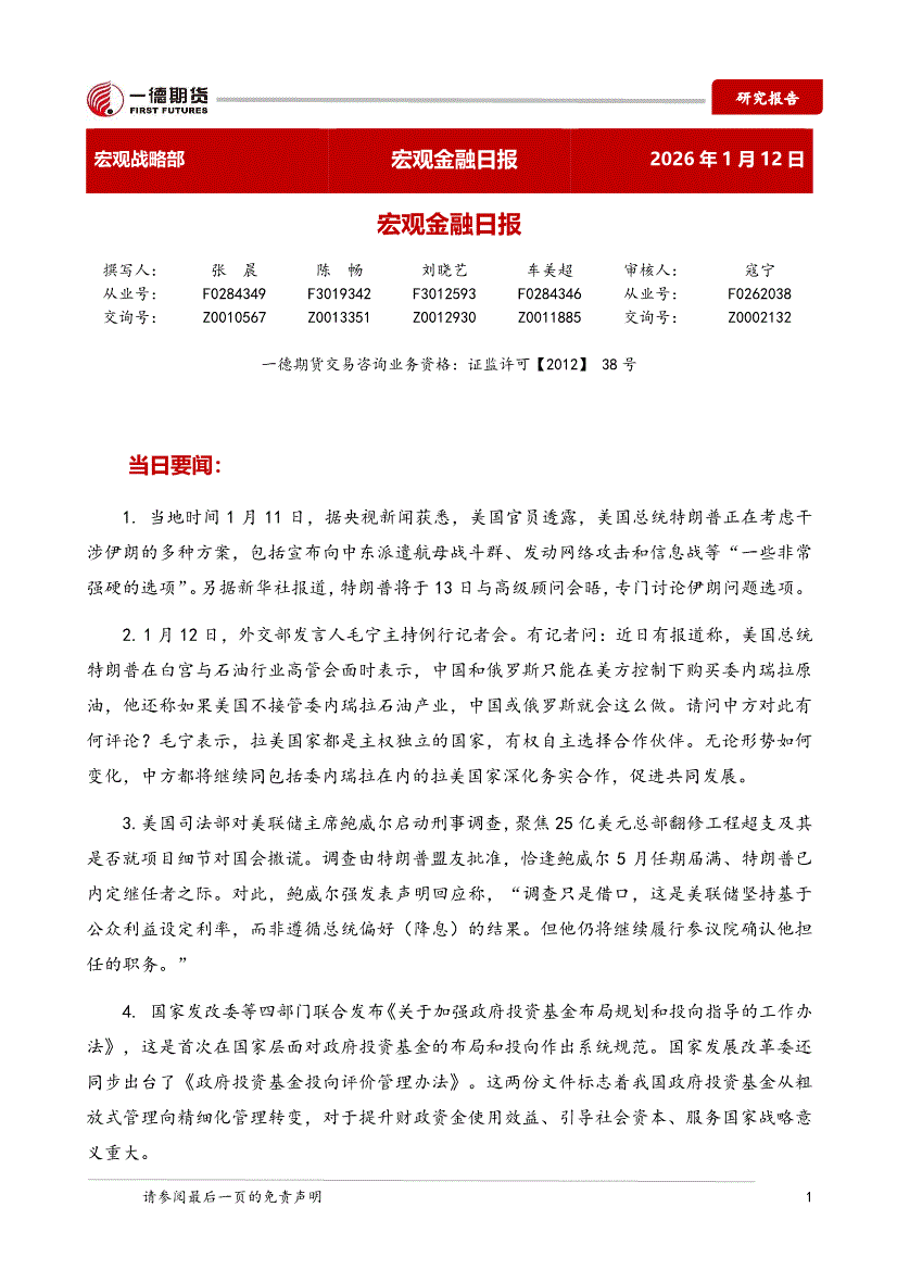 一德期货-宏观金融日报-260112