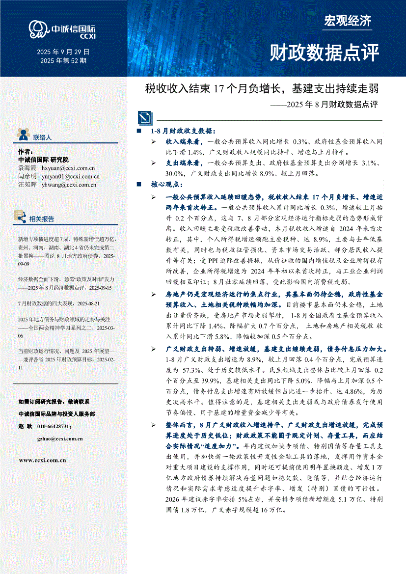 中诚信国际-2025年8月财政数据点评:税收收入结束17个月负增长,基建支出持续走弱-250929