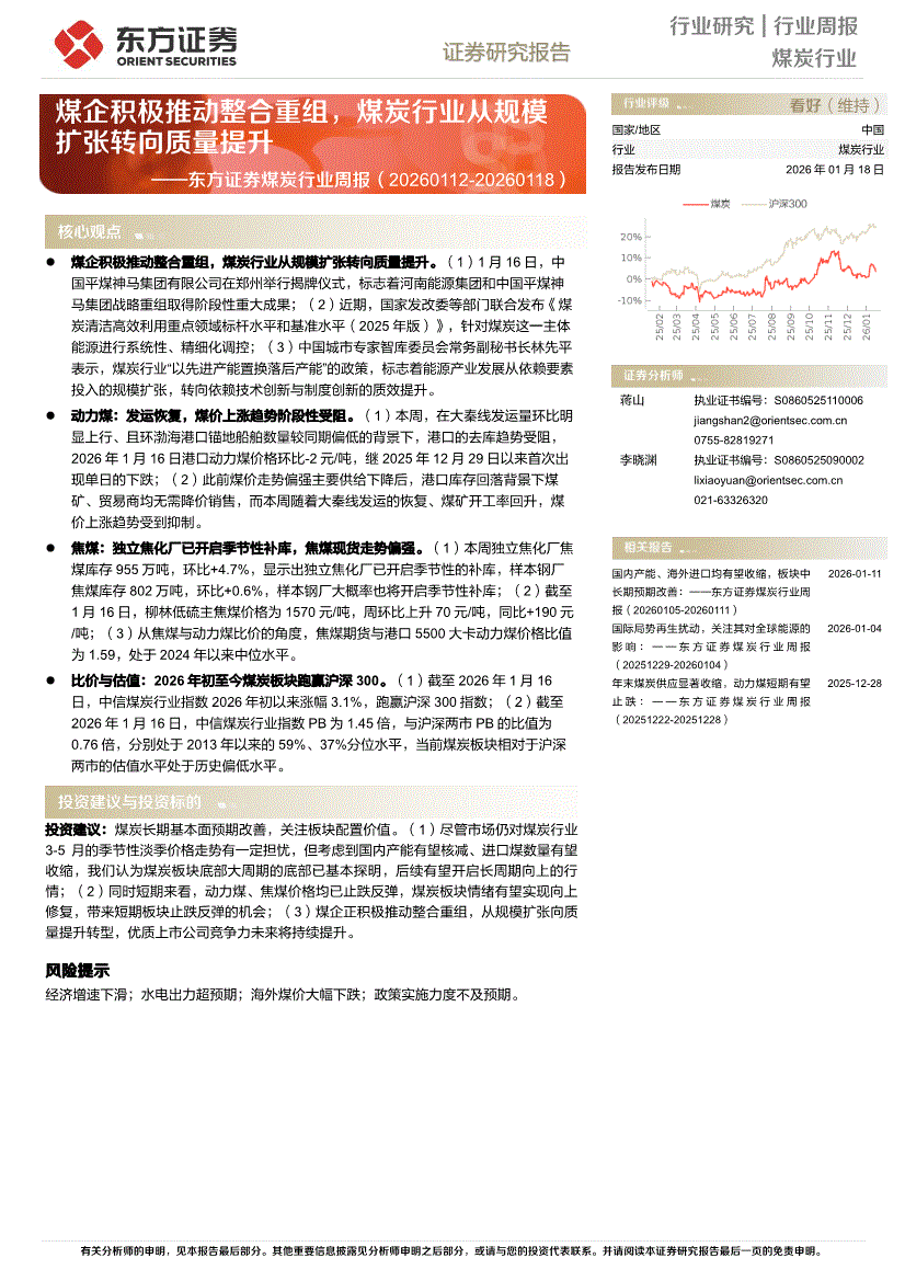 煤炭行业:东方证券-煤炭行业周报:煤企积极推动整合重组,煤炭行业从规模扩张转向质量提升-260118