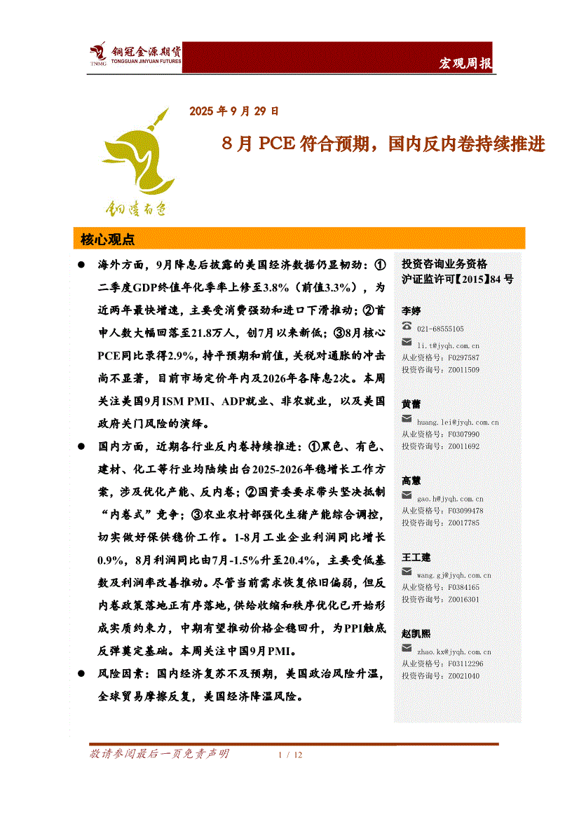 铜冠金源期货-宏观周报:8月PCE符合预期,国内反内卷持续推进-250929