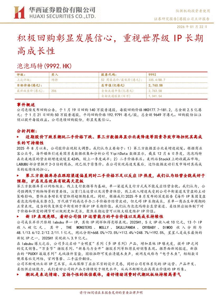 泡泡玛特:华西证券-泡泡玛特-9992.HK-积极回购彰显发展信心,重视世界级IP长期高成长性-260122