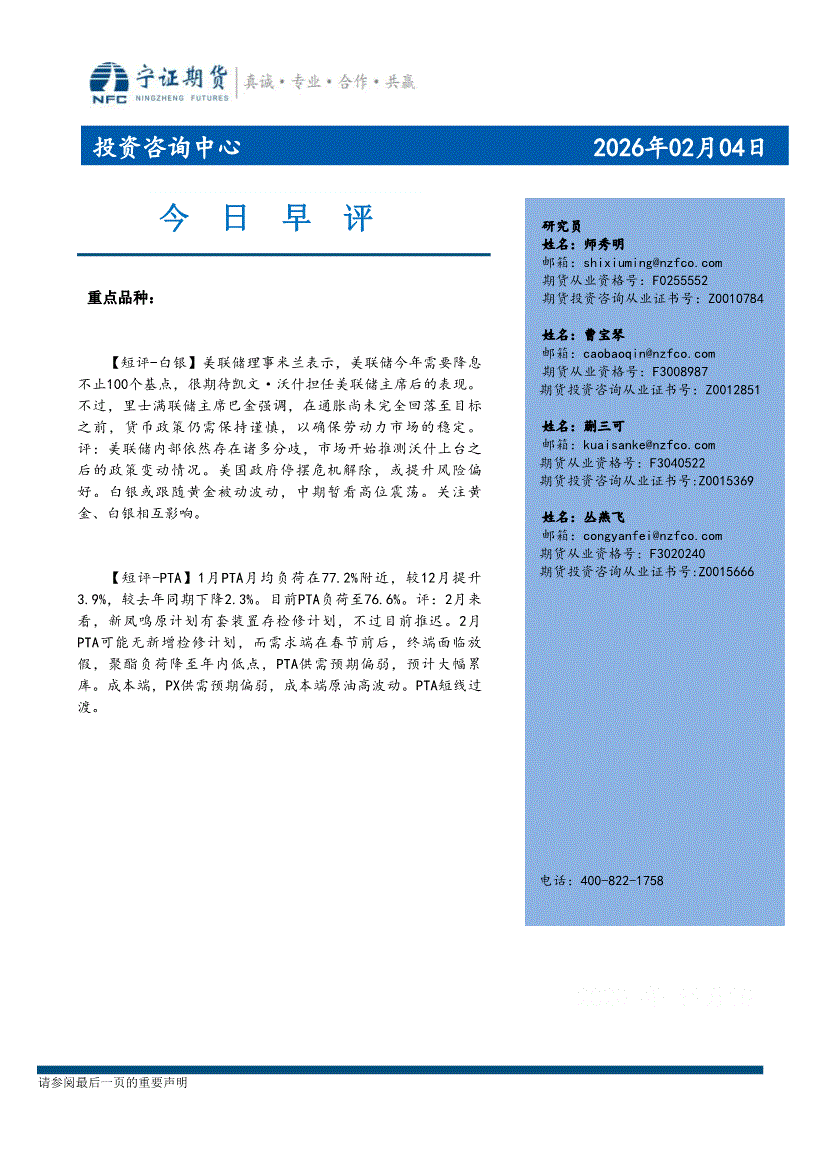 宁证期货-今日早评-260204