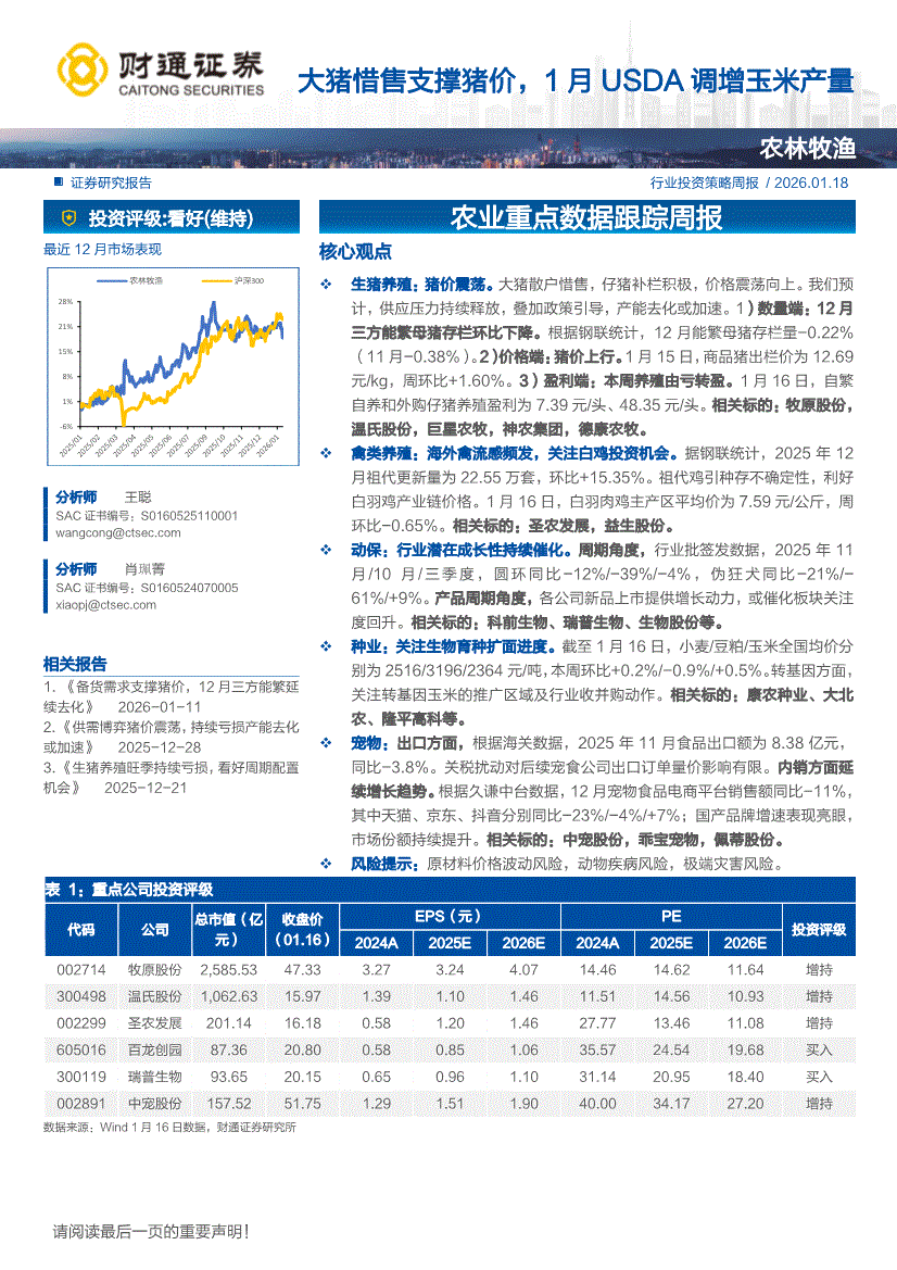 农业:财通证券-农业重点数据跟踪周报:大猪惜售支撑猪价,1月USDA调增玉米产量-260118