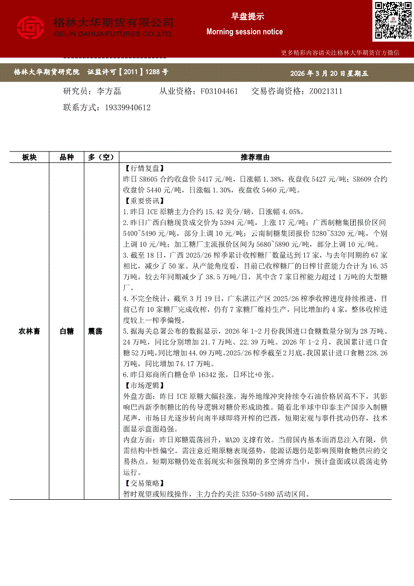 格林大华期货-早盘提示:白糖红枣橡胶-260320