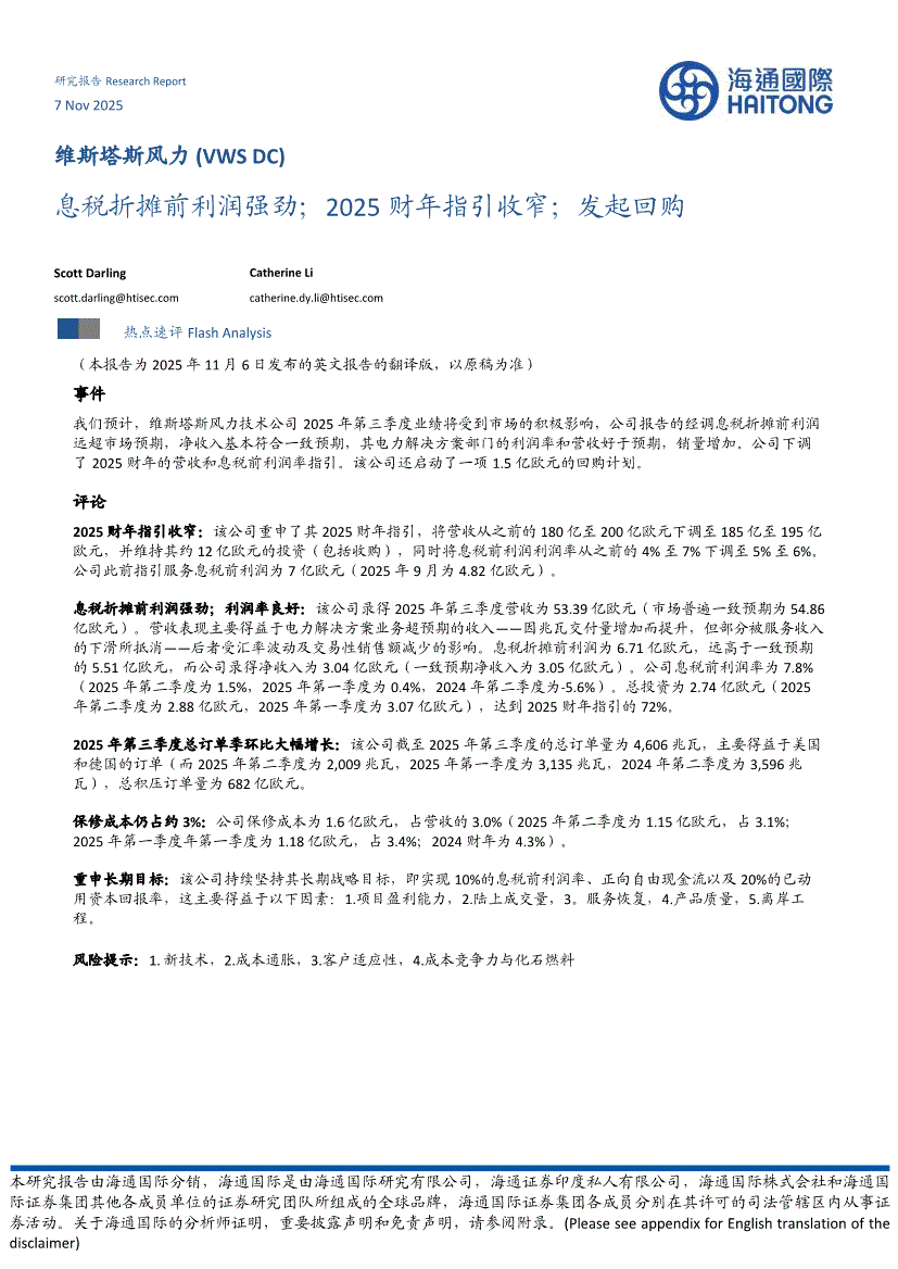 维斯塔斯风力:海通国际-维斯塔斯风力-VWS.DC-息税折摊前利润强劲;2025财年指引收窄;发起回购-251107