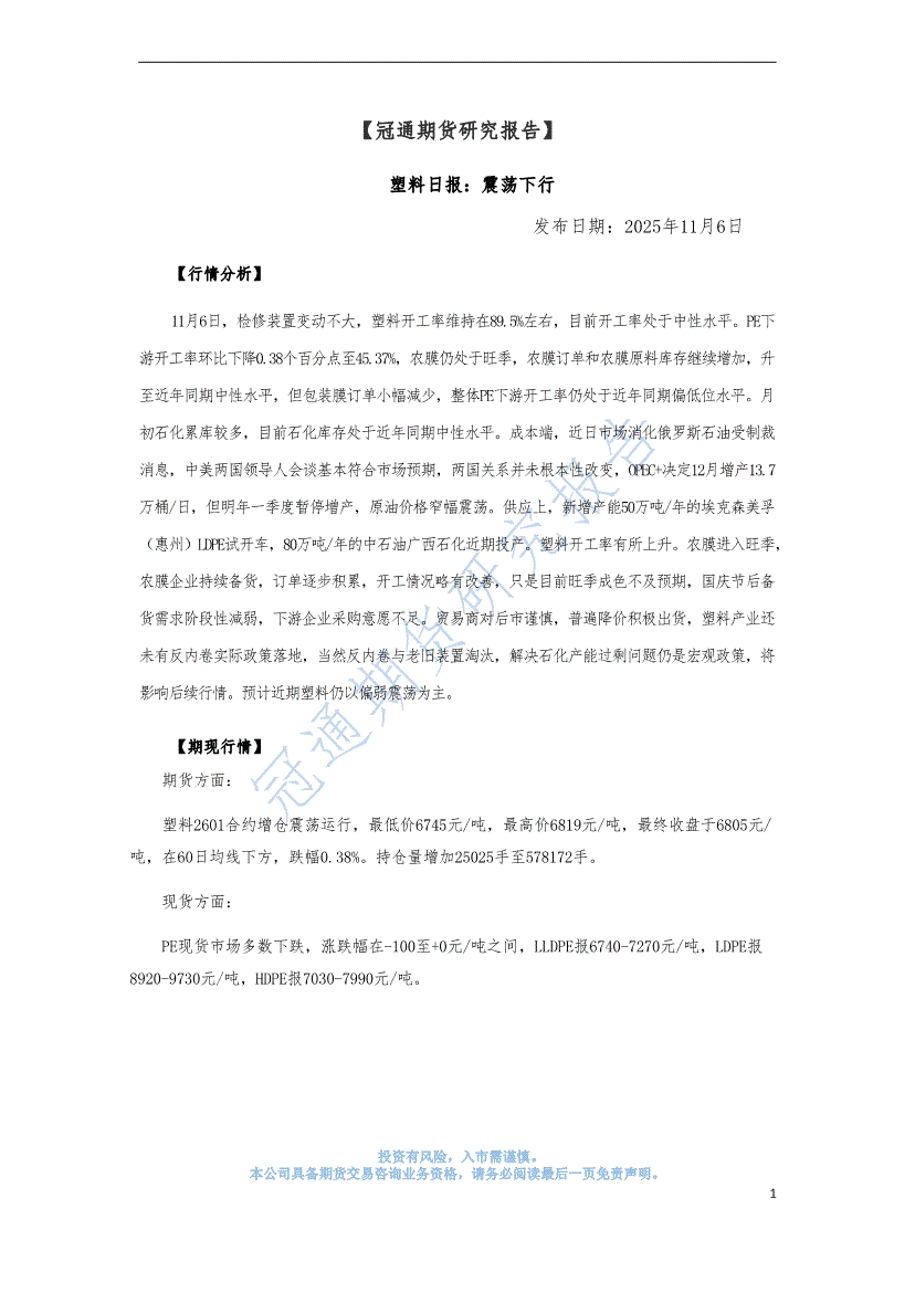 冠通期货-塑料日报:震荡下行-251106
