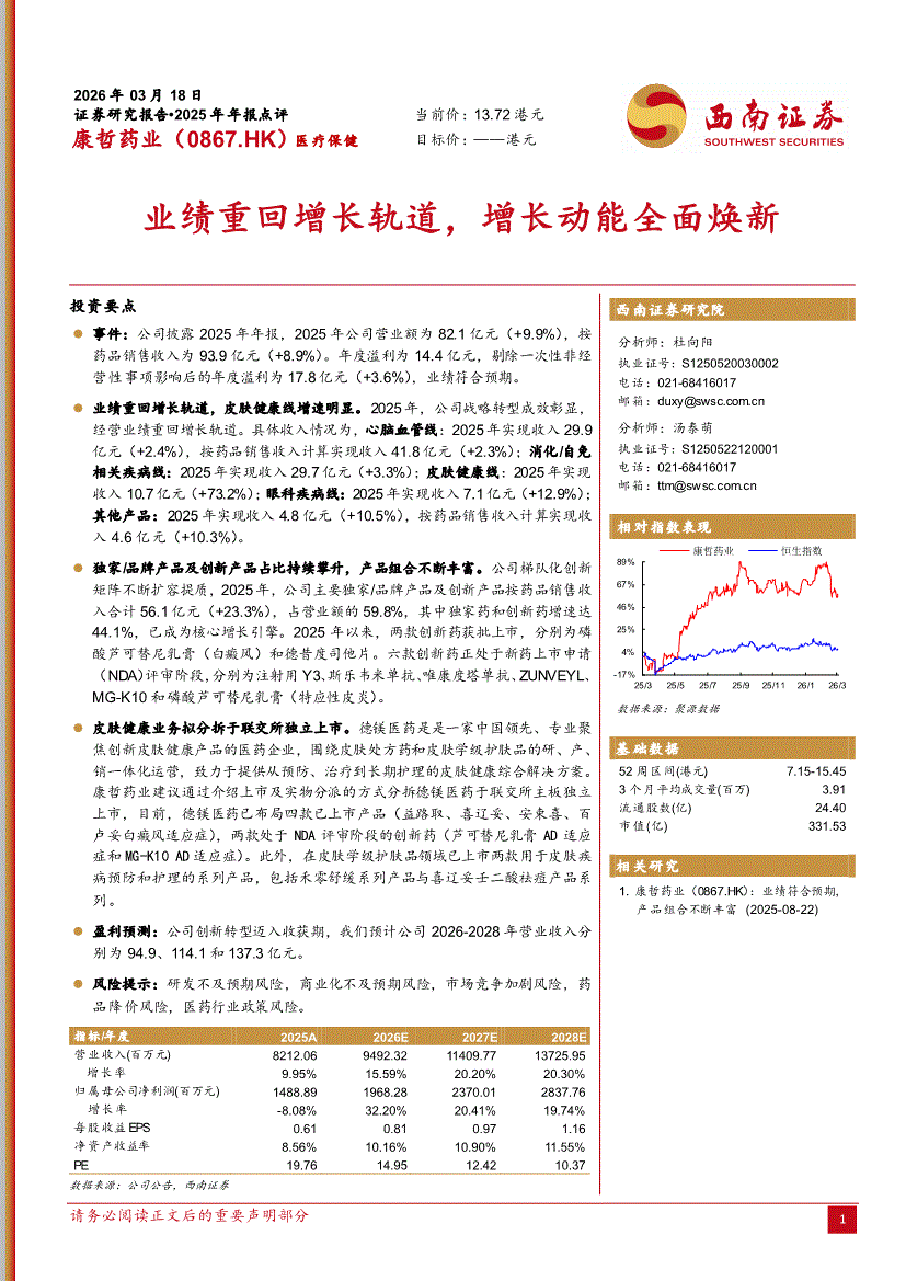 康哲药业:西南证券-康哲药业-0867.HK-业绩重回增长轨道,增长动能全面焕新-260318