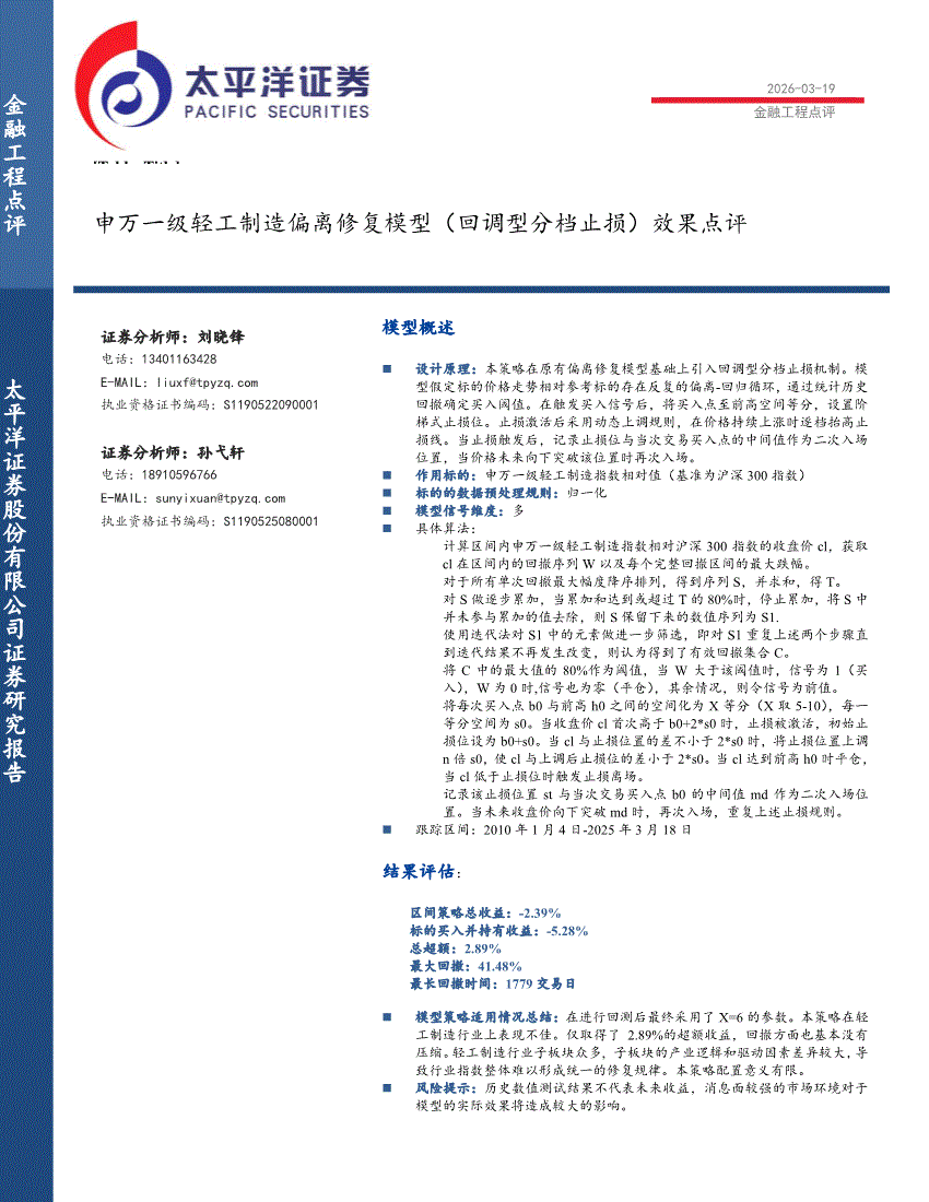 太平洋证券-申万一级轻工制造偏离修复模型(回调型分档止损)效果点评-260319