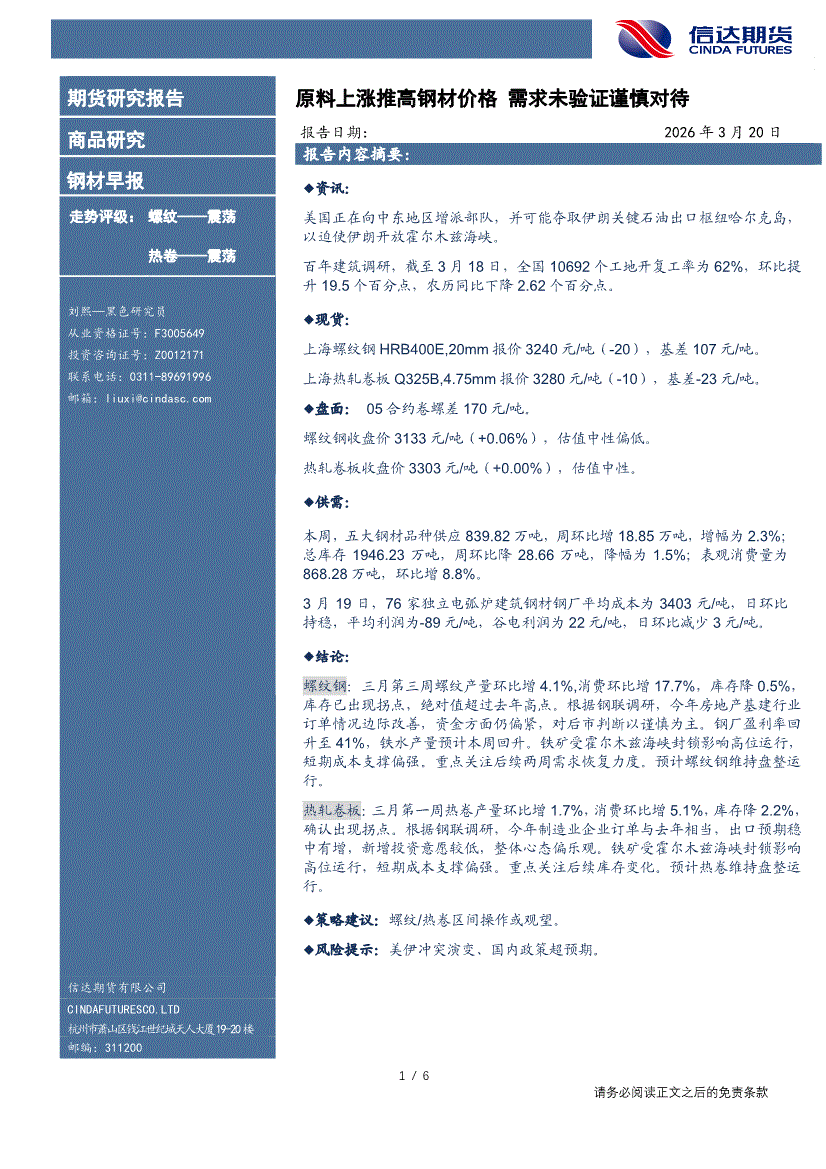 信达期货-钢材早报:原料上涨推高钢材价格,需求未验证谨慎对待-260320