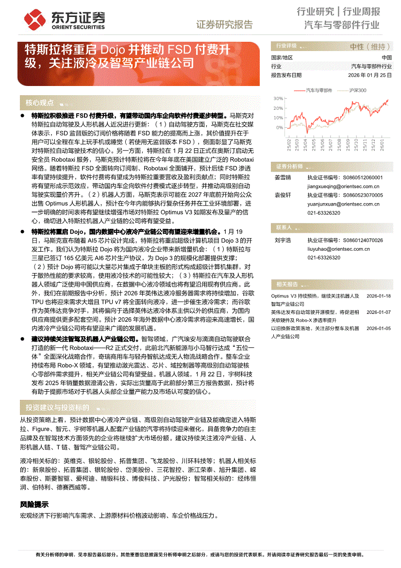 汽车与零部件行业:东方证券-汽车与零部件行业周报:特斯拉将重启Dojo并推动FSD付费升级,关注液冷及智驾产业链公司-260125