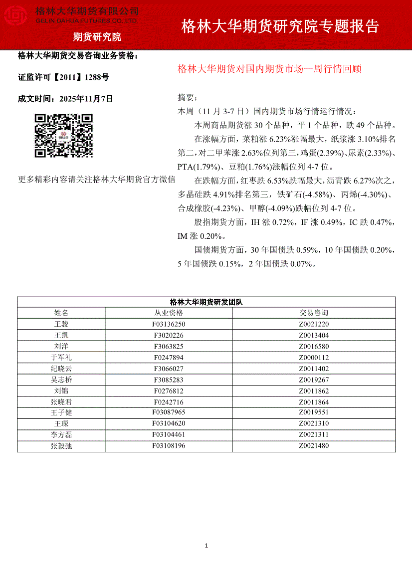 格林大华期货-对国内期货市场一周行情回顾-251107