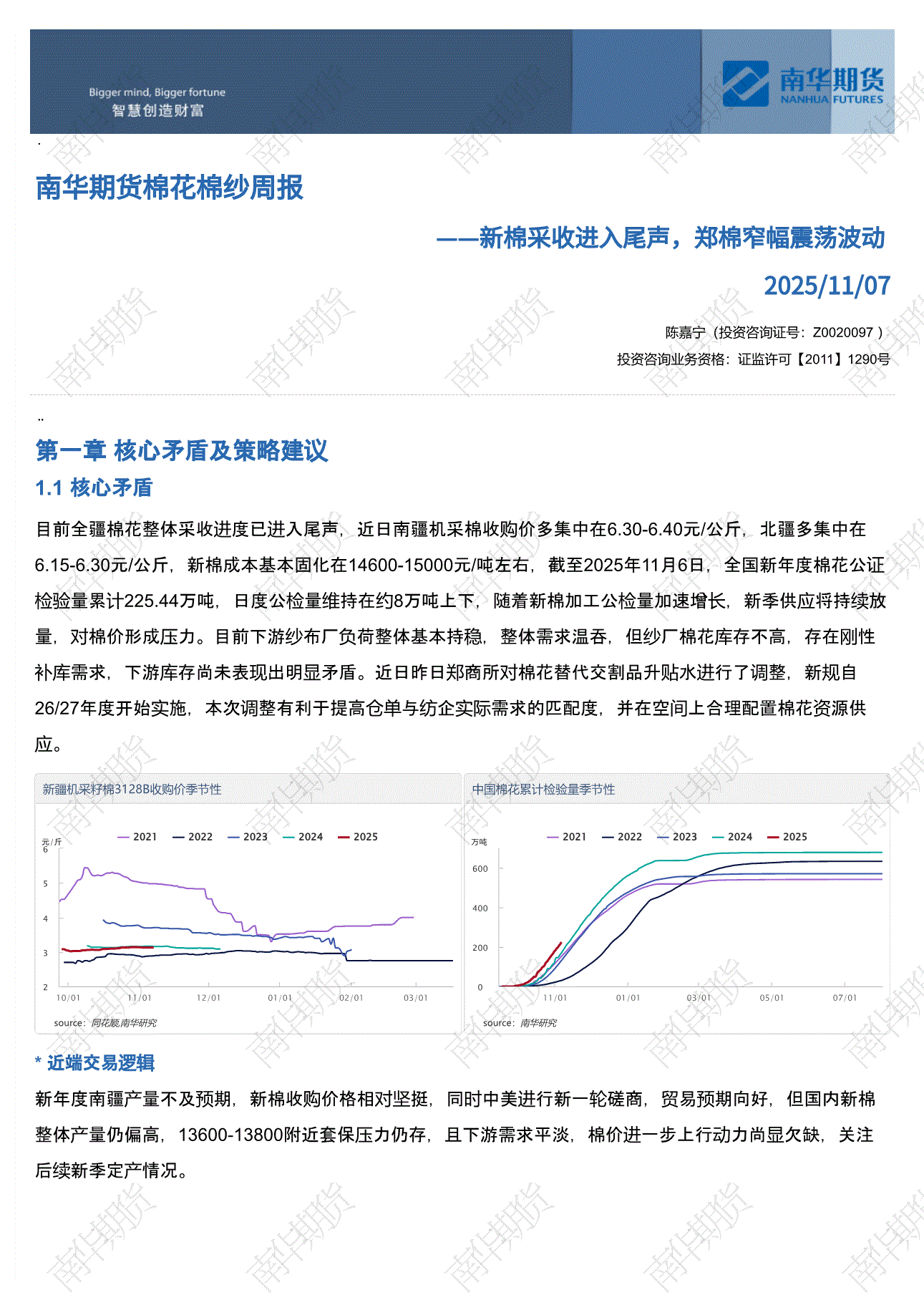 南华期货-棉花棉纱周报:新花采收进入尾声,郑棉窄幅震荡波动-251107