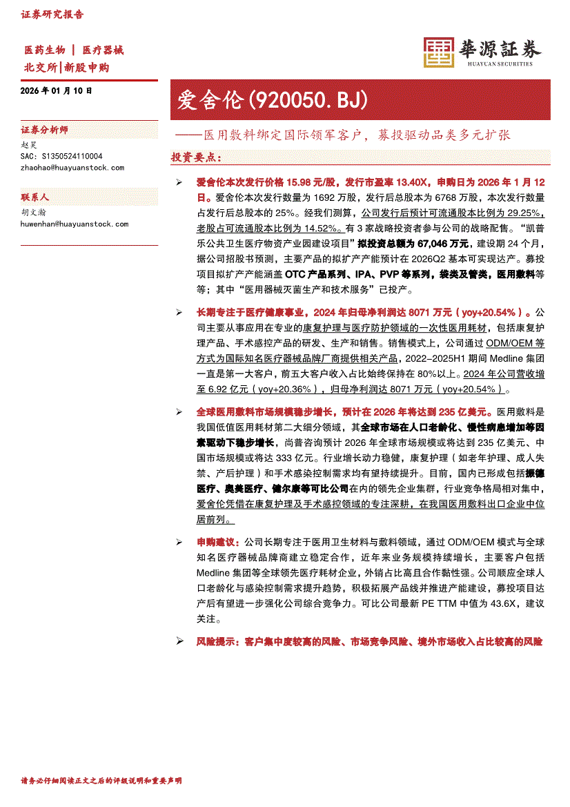爱舍伦:华源证券-爱舍伦-920050-医用敷料绑定国际领军客户,募投驱动品类多元扩张-260110