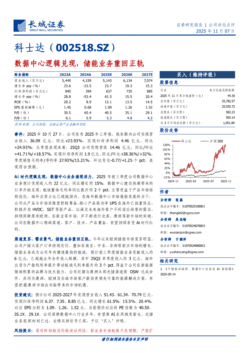 科士达:长城证券-科士达-002518-数据中心逻辑兑现,储能业务重回正轨-251107