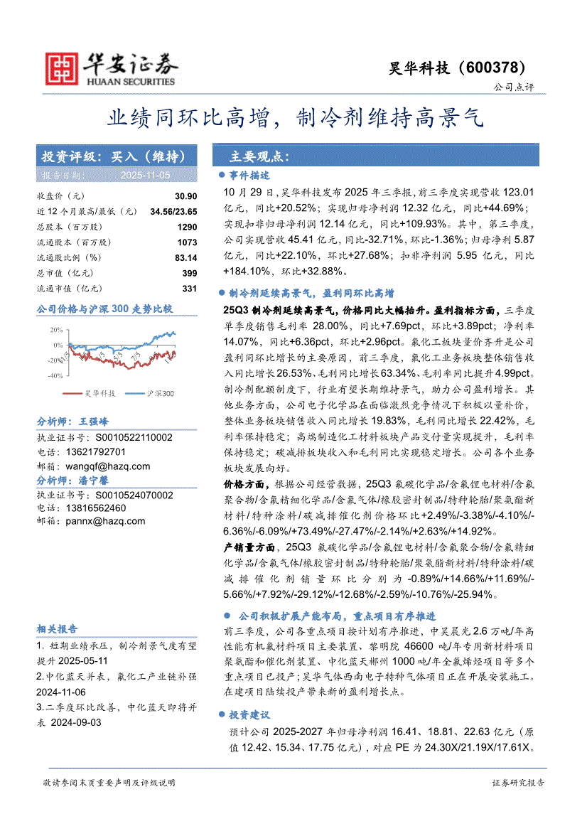 昊华科技:华安证券-昊华科技-600378-业绩同环比高增,制冷剂维持高景气-251105