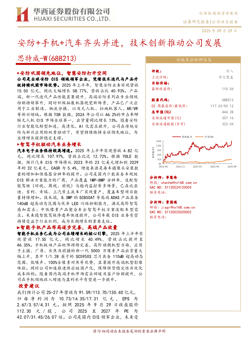 思特威:华西证券-思特威-688213-安防+手机+汽车齐头并进,技术创新推动公司发展-250929