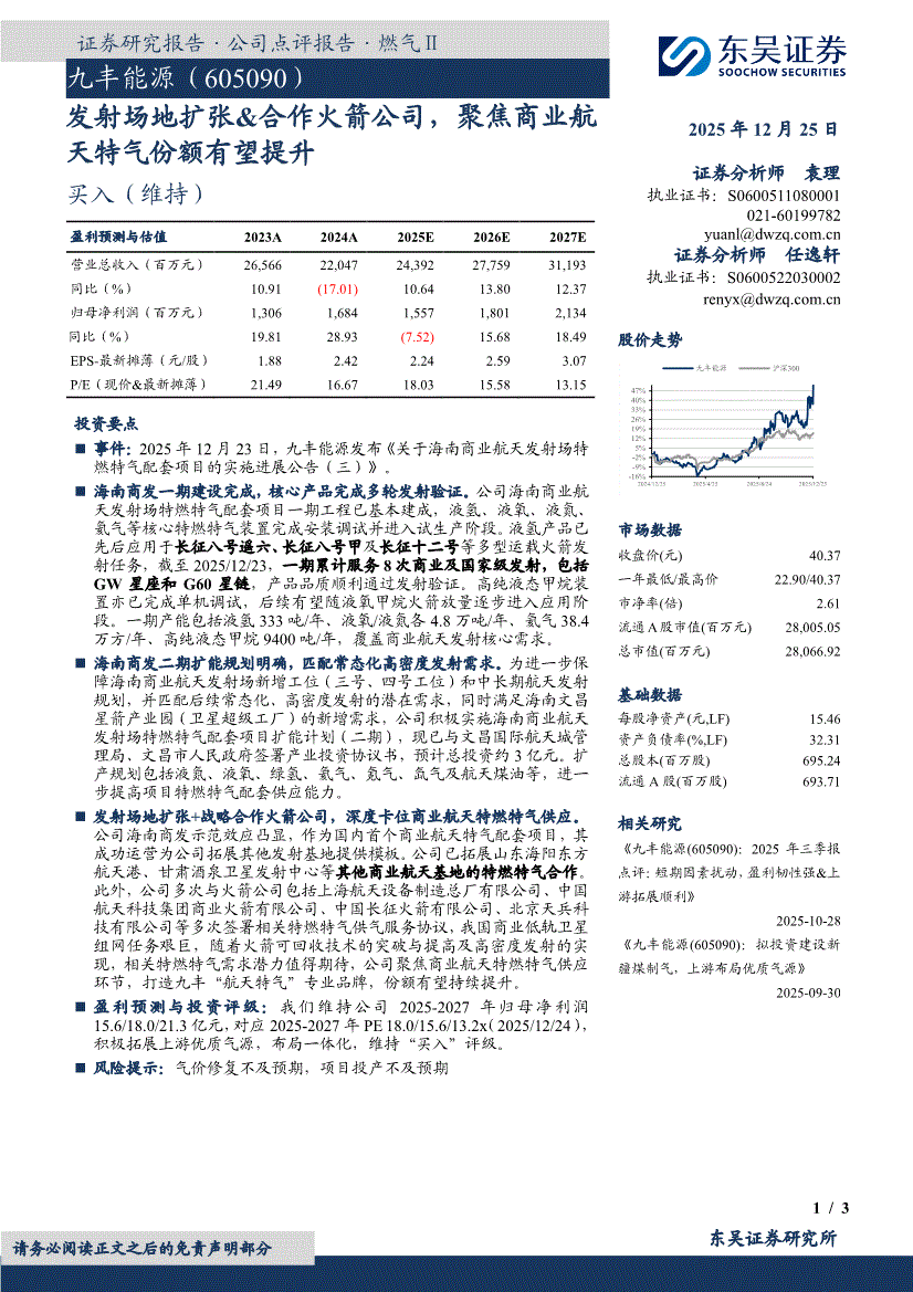 九丰能源:东吴证券-九丰能源-605090-发射场地扩张&合作火箭公司,聚焦商业航天特气份额有望提升-251225