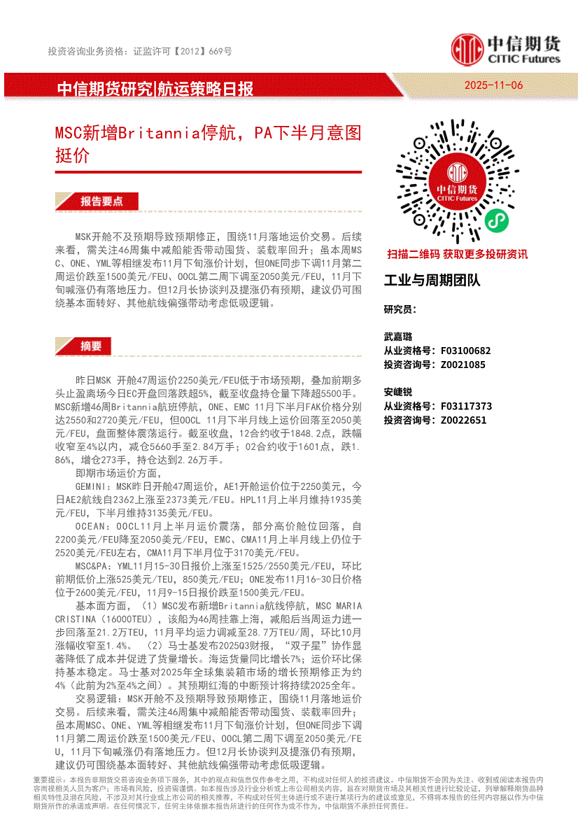 中信期货-航运策略日报:MSC新增Britannia停航,PA下半月意图挺价-251106