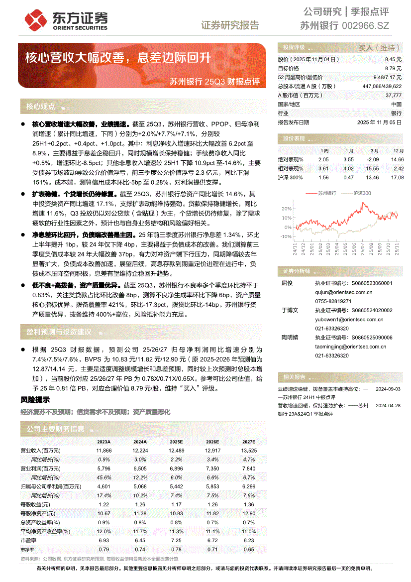 苏州银行:东方证券-苏州银行-002966-25Q3财报点评:核心营收大幅改善,息差边际回升-251105