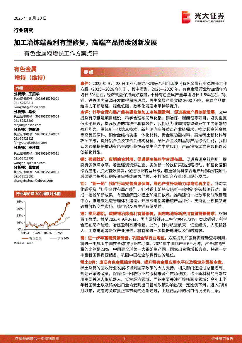 有色金属行业:光大证券-有色金属行业稳增长工作方案点评:加工冶炼端盈利有望修复,高端产品持续创新发展-250930