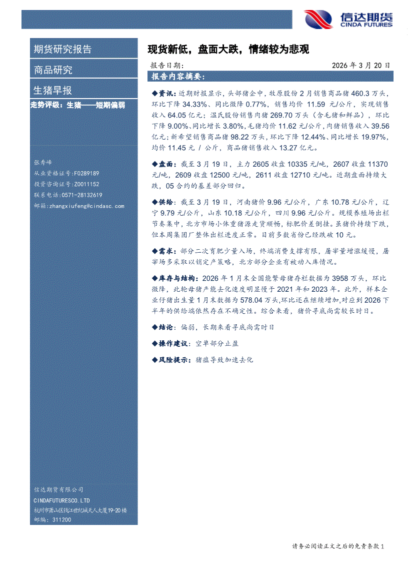 信达期货-生猪早报:现货新低,盘面大跌,情绪较为悲观-260320