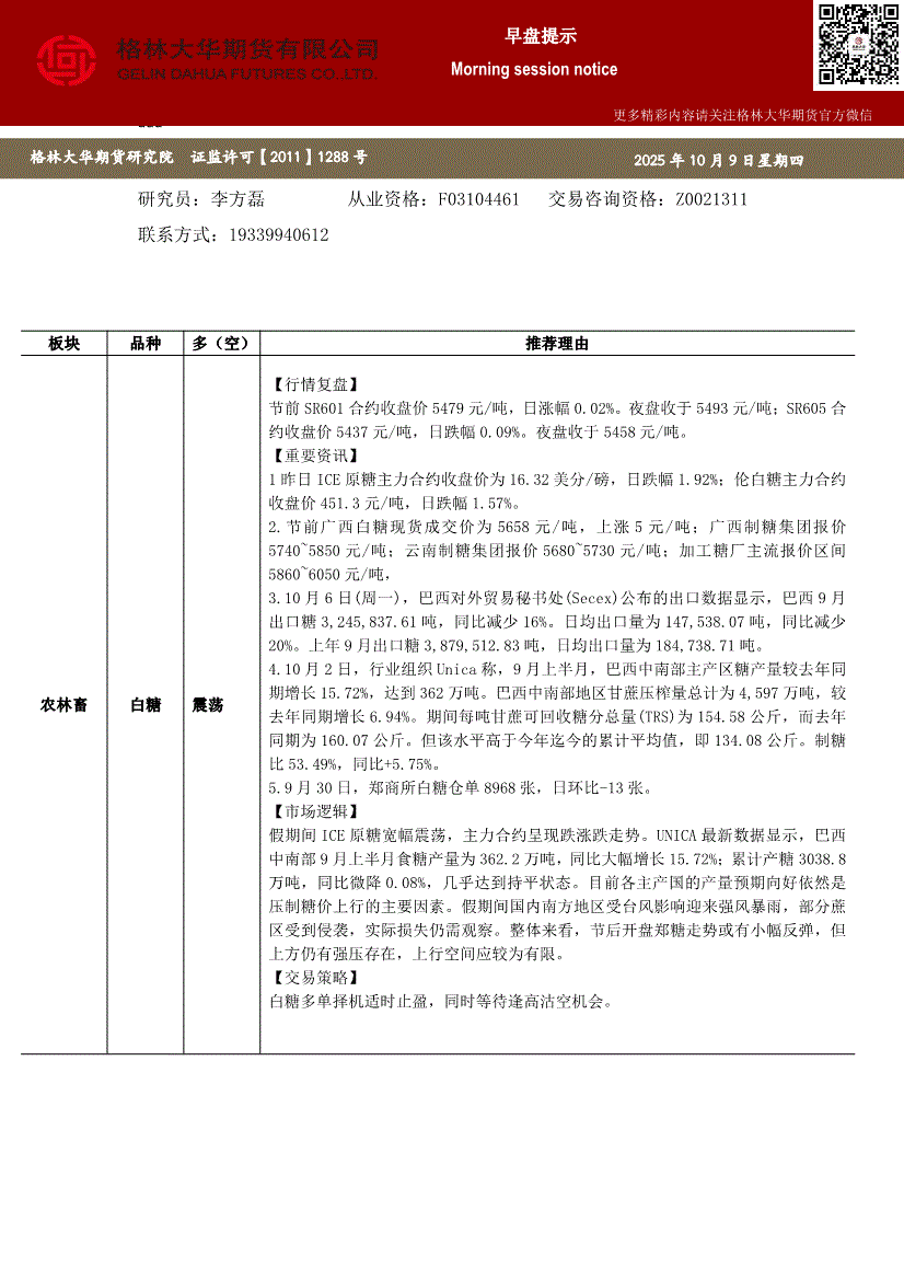 格林大华期货-早盘提示:白糖红枣橡胶系-251009