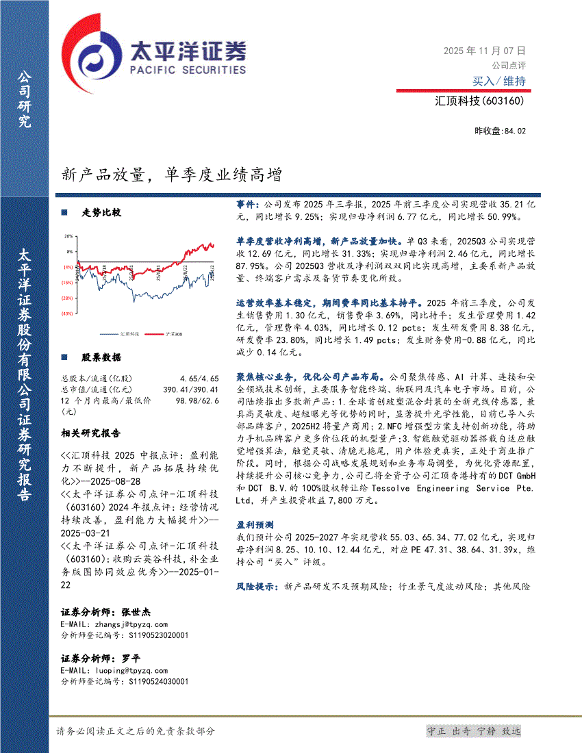汇顶科技:太平洋证券-汇顶科技-603160-新产品放量,单季度业绩高增-251107