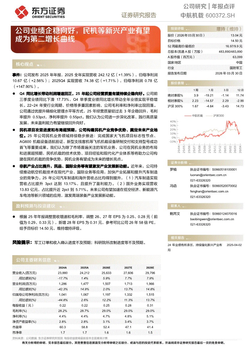 中航机载:东方证券-中航机载-600372-公司业绩企稳向好,民机等新兴产业有望成为第二增长曲线-260330