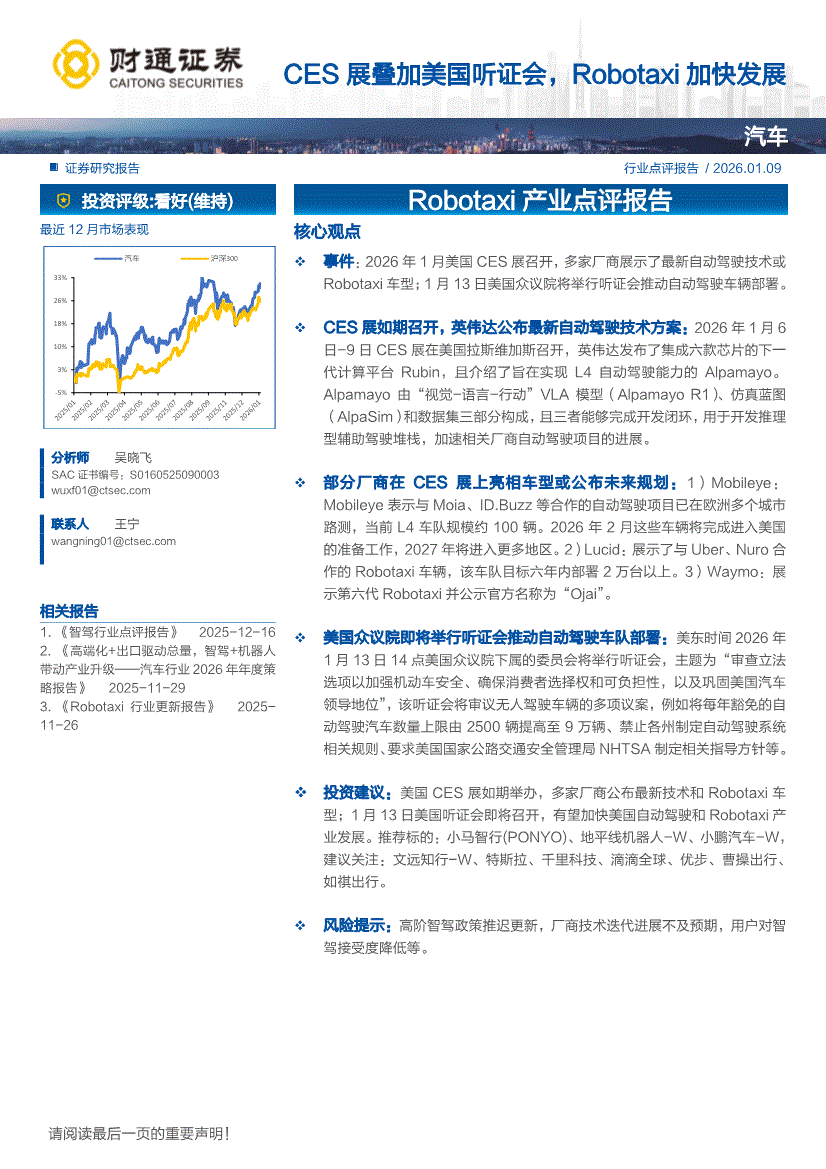 汽车行业:财通证券-汽车行业Robotaxi产业点评报告:CES展叠加美国听证会,Robotaxi加快发展-260109