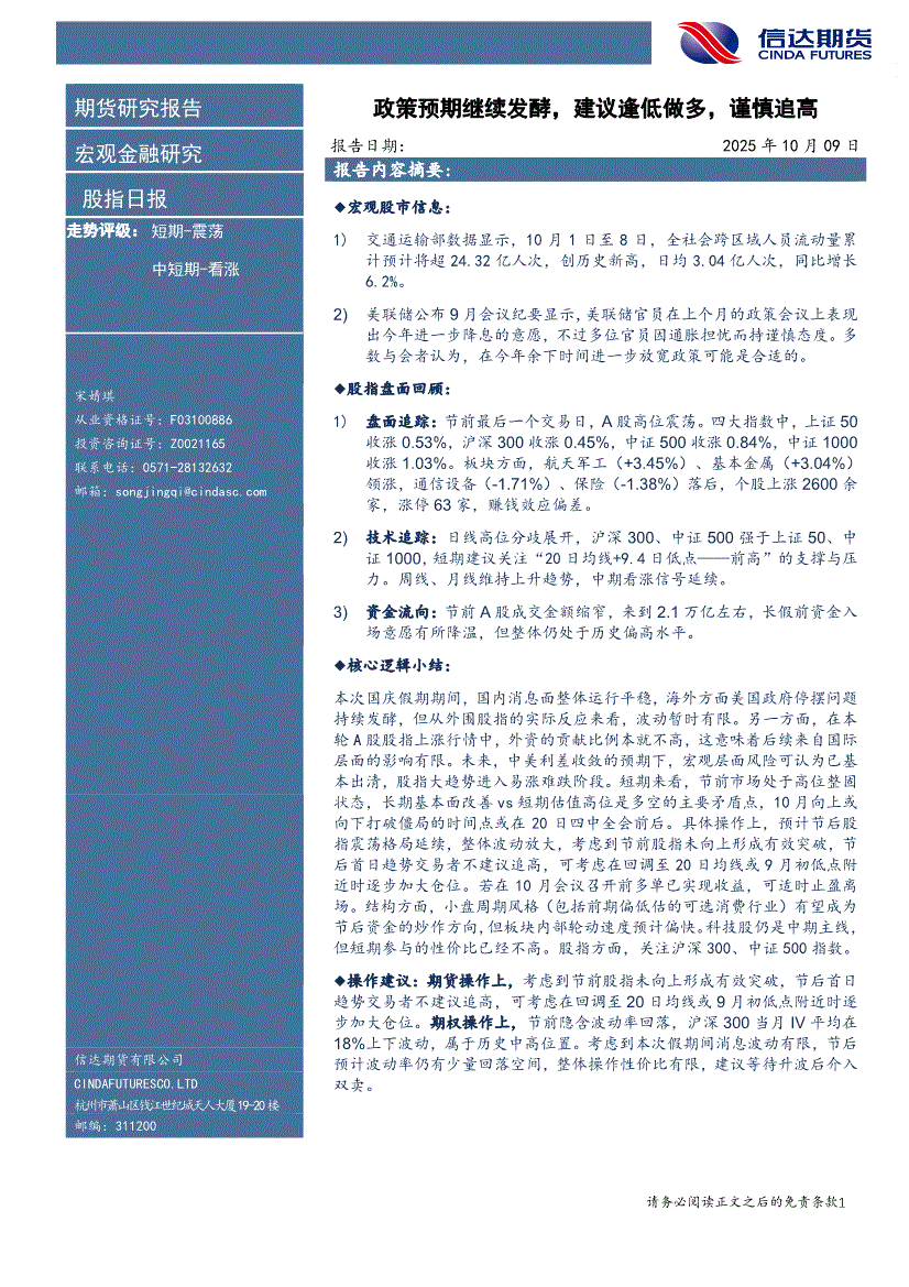 信达期货-股指日报:政策预期继续发酵,建议逢低做多,谨慎追高-251009