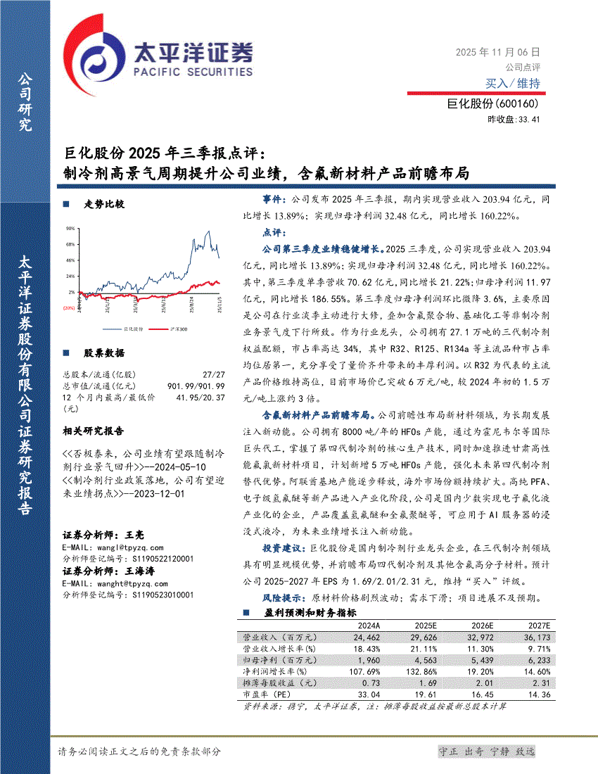 巨化股份:太平洋证券-巨化股份-600160-2025年三季报点评:制冷剂高景气周期提升公司业绩,含氟新材料产品前瞻布局-251106
