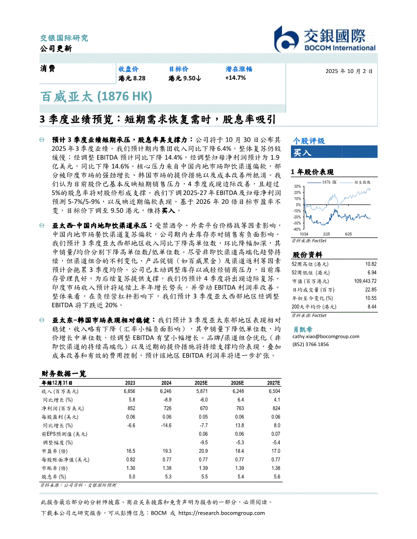 百威亚太:交银国际-百威亚太-1876.HK-3季度业绩预览,短期需求恢复需时,股息率吸引-251002