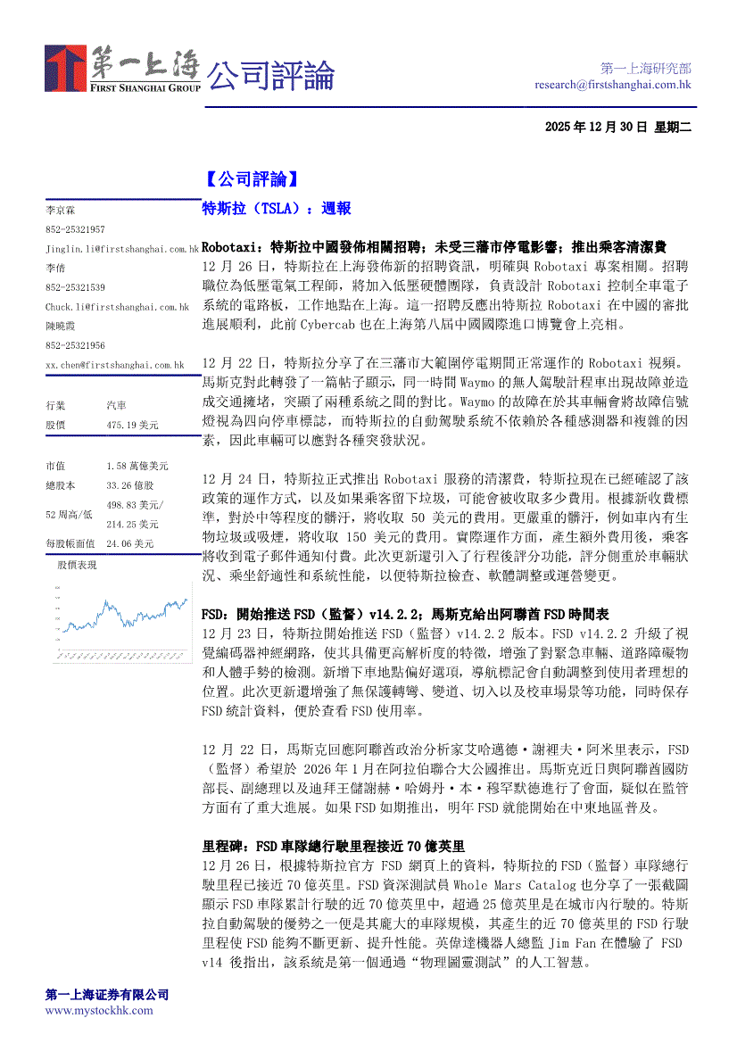 特斯拉:第一上海-特斯拉-TSLA.US-公司評論-251230