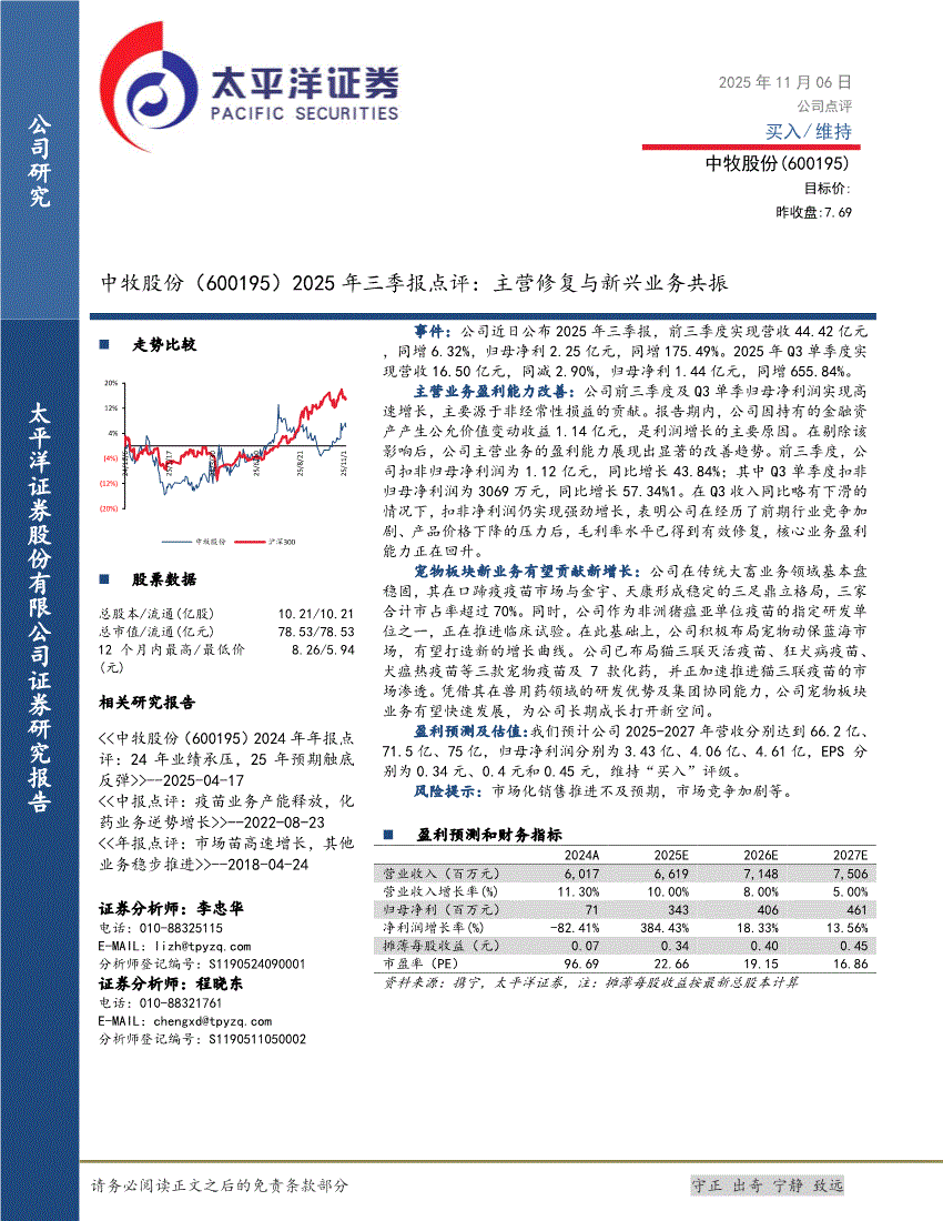 中牧股份:太平洋证券-中牧股份-600195-2025年三季报点评:主营修复与新兴业务共振-251106