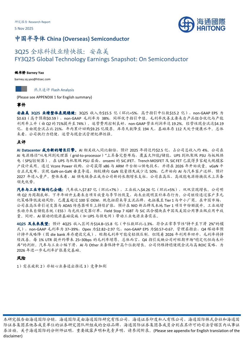 半导体行业:海通国际-中国半导体行业3Q25全球科技业绩快报:安森美-251105