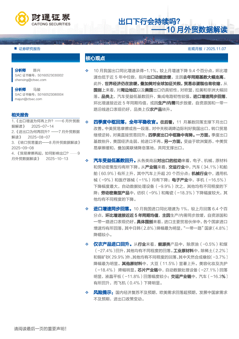 财通证券-10月外贸数据解读:出口下行会持续吗?-251107