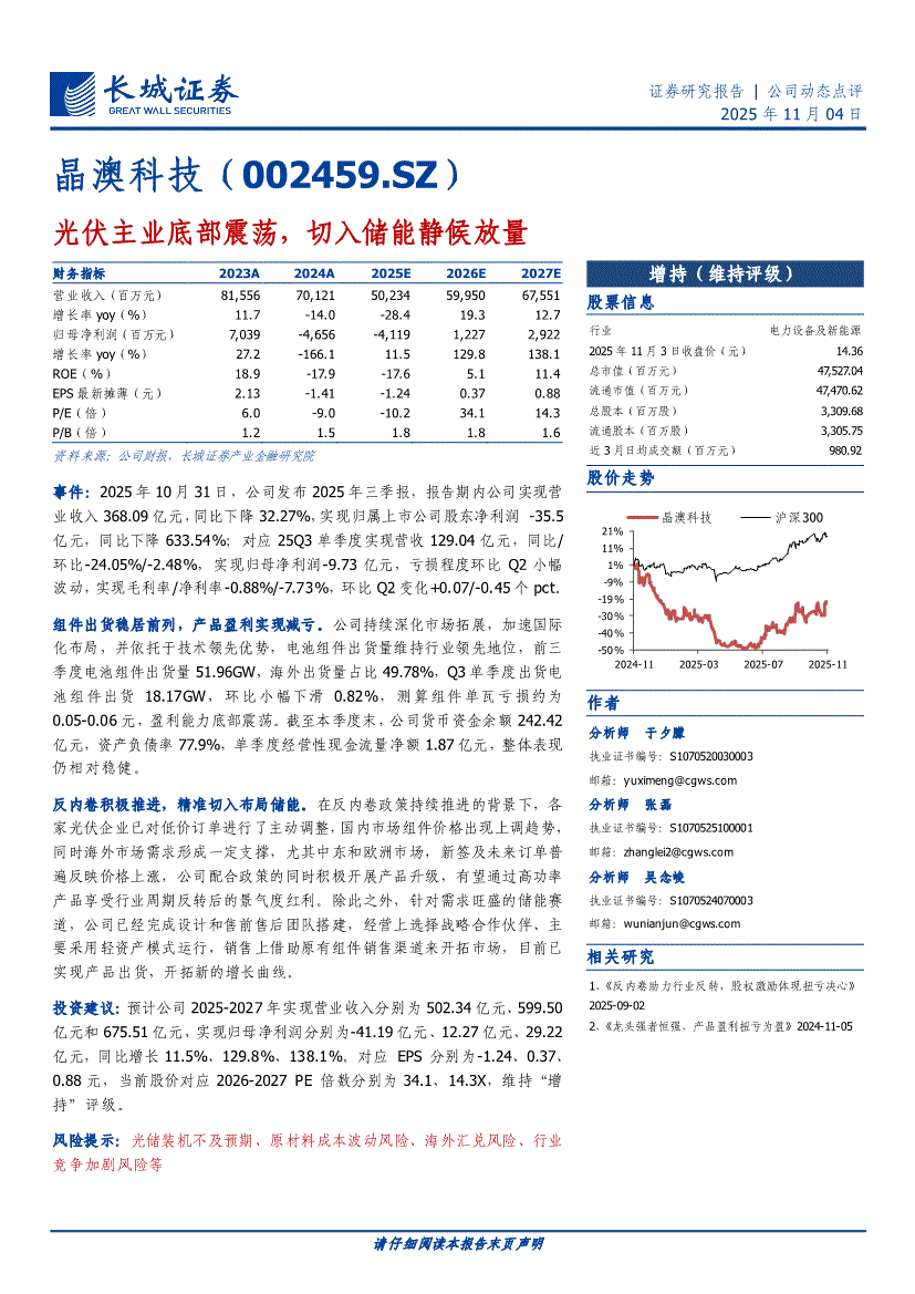 晶澳科技:长城证券-晶澳科技-002459-光伏主业底部震荡,切入储能静候放量-251104